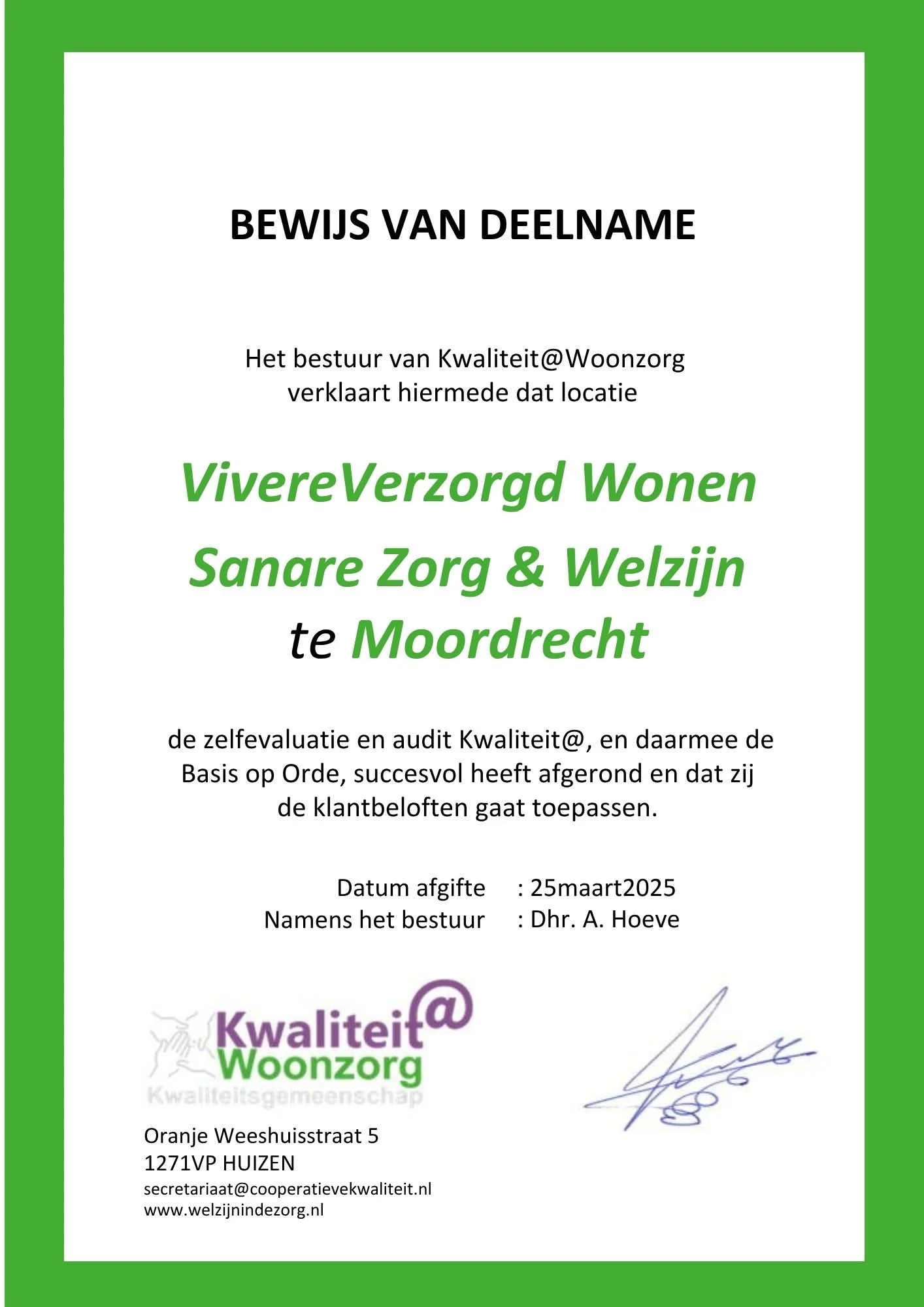 Sanare heeft in 2025 de audit Basis op Orde behaald. Daarmee zijn wij toegelaten tot Kwaliteit@. In 2026 vindt een waarderende visitatie plaats door een collega-zorgorganisatie. In 2027 volgt opnieuw een formele audit.